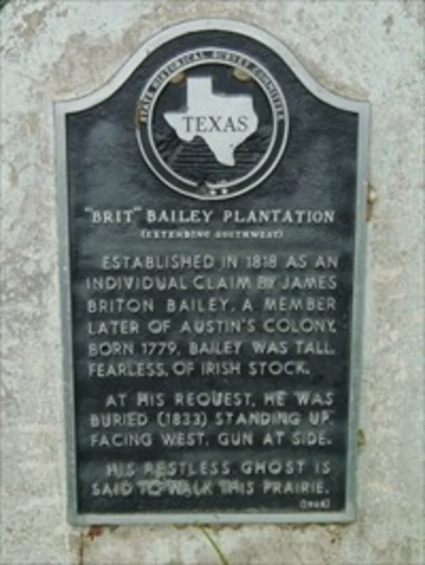 Former West Columbia High School teacher James A. “Deacon” Creighton writes in his “A Narrative History of Brazoria County, Texas” about Bailey, “Another citizen of Brazoria County who arrived prior to 1822 was James Briton (Brit) Bailey. He also was a veteran of the War of 1812 (along with early Anglo Texan George Smeathers or Smithers), and when he came to Texas he brought with him his wife and six children. He was the first to raise a pole cabin on the prairie now named for him (Bailey’s Prairie). According to family records, he was a descendant of the famed Robert Bruce of Scotland. Because of his colorful personality and individualistic eccentricities, legends have gathered about the memory of Brit Bailey like a tail streaming from a comet. It is said that he was buried standing up, as provided for in his will, ready to confront without fear whatever might come.