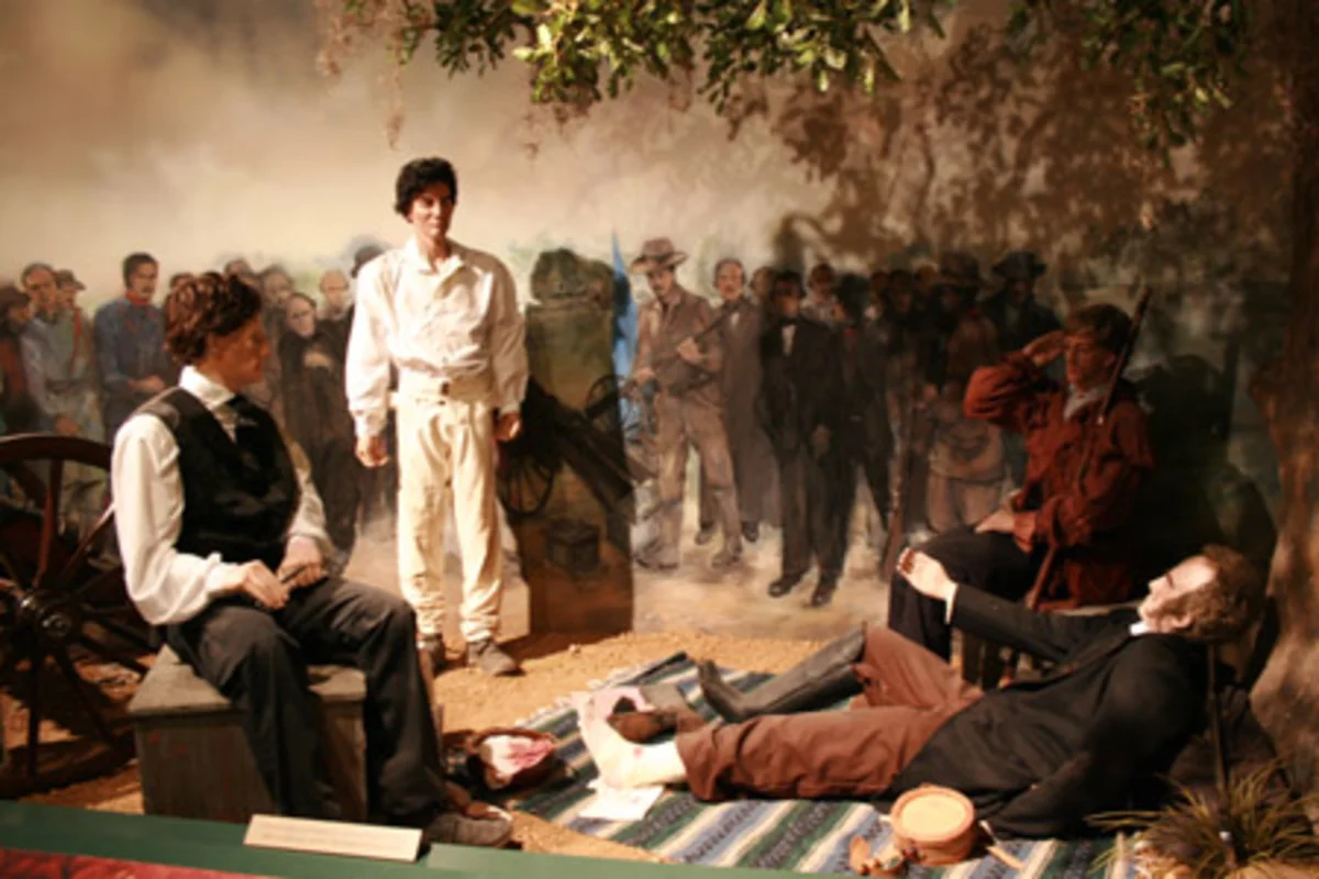 A painting of Antonio Lopez de Santa Anna, president of Mexico, surrendering to the wounded General Sam Houston at San Jacinto in 1836