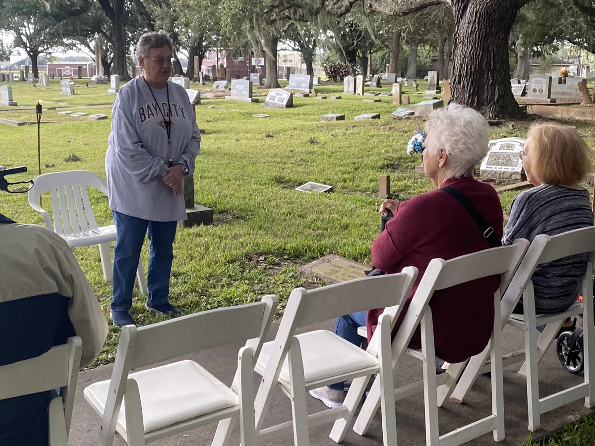 Linda Miska only got to finish her presentation to the first group of visitors when the rain and threat of lightning interrupted her speech to the second group. Linda, a retired West Columbia Junior High School teacher, was portraying her former high school basketball coach, Mattie Sue Ringgold. Linda played college basketball at Sam Houston State University after being a standout player for Coach Ringgold at Bay City High School.