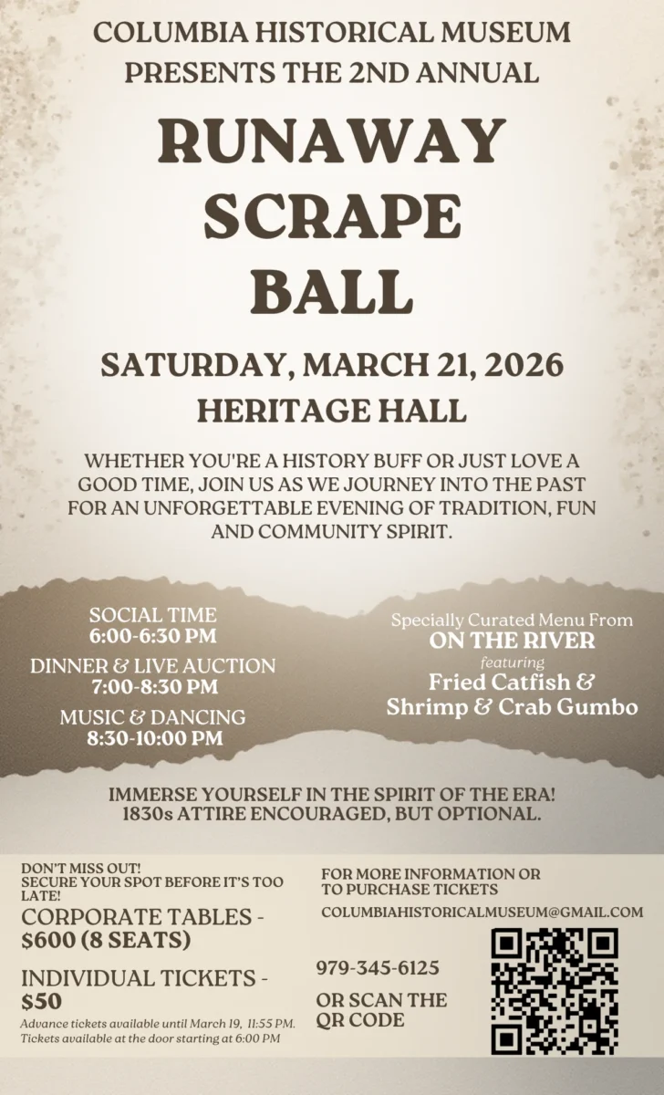 The Second Annual Runaway Scrape Ball will be held on Saturday, March 21, 2026, at Heritage Hall in West Columbia. The public is invited and encouraged to join members of the Columbia Historical Museum for the big gala in the old gymnasium at what used to be West Columbia High School/Junior High School. This event is your local museum’s primary fundraiser of the year.